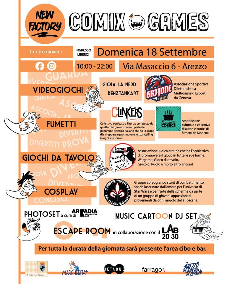 AREZZO – Domenica 18 settembre il centro giovani e adolescenti New Factory di Arezzo ospiterà la prima edizione della rassegna Comix & Games 10 alle 22 in via Masaccio 6, Arezzo giochi da tavolo, videogame e cosplay con interviste, dimostrazioni di gioco, musica, esibizioni di cosplayer, dirette twitch, escape room, set fotografici, area market e area cibo/bar. Si tratterà di un’occasione anche per far conoscere al pubblico gli spazi totalmente gratuiti messi a disposizione da New Factory, il nuovo centro giovani nato dal progetto del Comune di Arezzo Giovani Protagonisti finalizzato a valorizzare le attività rivolte alla fascia di età compresa tra 15 e 35 anni.