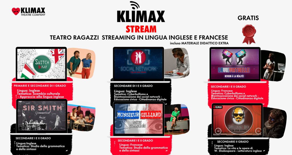 Gli studenti aretini potranno così fruire, seduti nelle rispettive aule e senza pagare il biglietto, di sei spettacoli, di cui quattro in inglese – Switch&Play, Social Network, Sir Smith, Shakespeare is back – e due in francese – La vie Virtuelle, Monsieur Gilliard – illimitatamente e in qualsiasi momento nel corso dellanno scolastico 2022/2023. È un processo a cascata quello previsto dallapposita convenzione: Klimax fornirà al Comune le credenziali di accesso alla piattaforma, il Comune a sua volta le girerà direttamente alle scuole che le metteranno a disposizione dei docenti e delle classi interessate. Ma non si tratta solo di un palcoscenico online. La compagnia Klimax Theatre Company, nata dallidea dellattore, drammaturgo e regista teatrale Luca Varone, grazie alla creazione di spettacoli ad hoc e al lavoro di attori madrelingua, ambisce a far sì che le nuove generazioni possano avvicinarsi, con gli strumenti della transizione digitale, sia al teatro inteso in senso classico sia alle sperimentazioni e innovazioni dello stesso linguaggio teatrale. Klimax Stream esordisce inoltre nella primavera del 2020, in piena pandemia, con i teatri chiusi e gli studenti costretti a rinunciare alla loro fruizione come fonte alternativa alla didattica tradizionale. Lo streaming, subito rivolto alle scuole di ogni ordine e grado attraverso qualsiasi dispositivo digitale, dalla LIM in classe al cellulare dello studente, si è rivelato vincente proprio per avere sopperito a questa mancanza. Adesso l’obiettivo è diffonderlo in tutte le regioni, in quanto il progetto è volto a supportare la cultura e lapprendimento delle lingue inglese e francese nelle scuole, utilizzando un nuovo linguaggio teatrale di completamento e/o sostituzione alla consuetudinaria partecipazione live agli spettacoli matinée. Accanto agli spettacoli, l’interattività della piattaforma si apre ad altre funzionalità: trattare topic importanti per gli studenti e informarli su cyberbullismo, dipendenza digitale, educazione civica, letteratura straniera, con contenuti di approfondimento, studio e ricerca. Fornendo al tempo stesso materiale didattico digitale e questionari per valutare l’apprendimento in tempo reale, fungere da vero e proprio laboratorio linguistico e da spazio di confronto e connessione real-time tra studenti.
