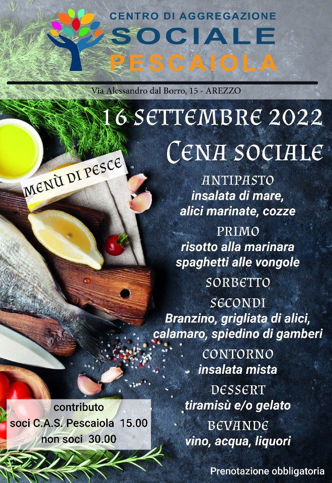 Arezzo – Il Centro di Aggregazione Sociale Pescaiola organizza venerdì prossimo, 16 settembre, una cena sociale a base di pesce. La cena sarà l’occasione per rilanciare le attività del circolo; il più grande centro di aggregazione sociale delle città di Arezzo. Sono più di quattrocento, infatti, i cittadini e le cittadine aretine che animano le attività del circolo. Cultura, aggregazione e ricreazione: queste le principali progettualità che illustreremo venerdì sera.