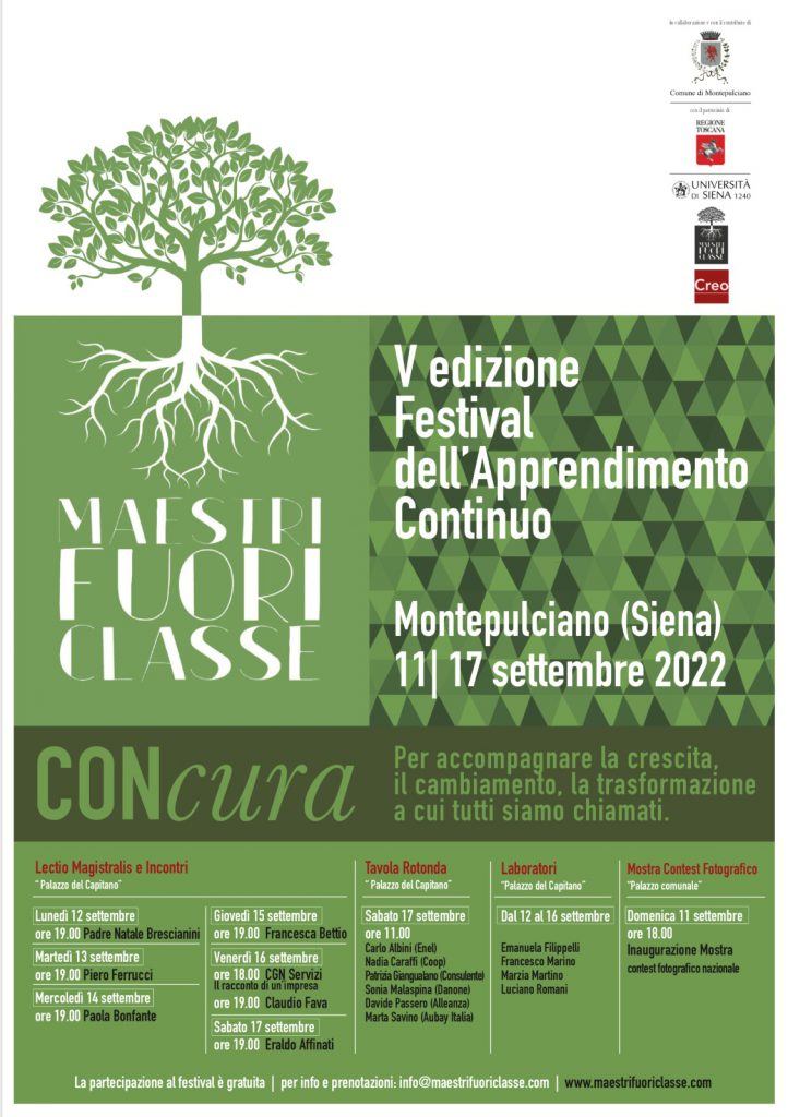 MONTEPULCIANO – Sette giorni per confrontarsi e dialogare sulle buone idee e per affrontare al meglio i cambiamenti che stanno interessando la nostra esistenza, tra guerra, inflazione e pericolo pandemia. Questo l’obiettivo del Festival dell’Apprendimento Continuo, in programma dall’11 al 17 settembre a Montepulciano (SI), promosso dall’Associazione Maestri Fuori classe, in collaborazione e con il contributo del Comune di Montepulciano, giunto quest’anno alla sua V edizione