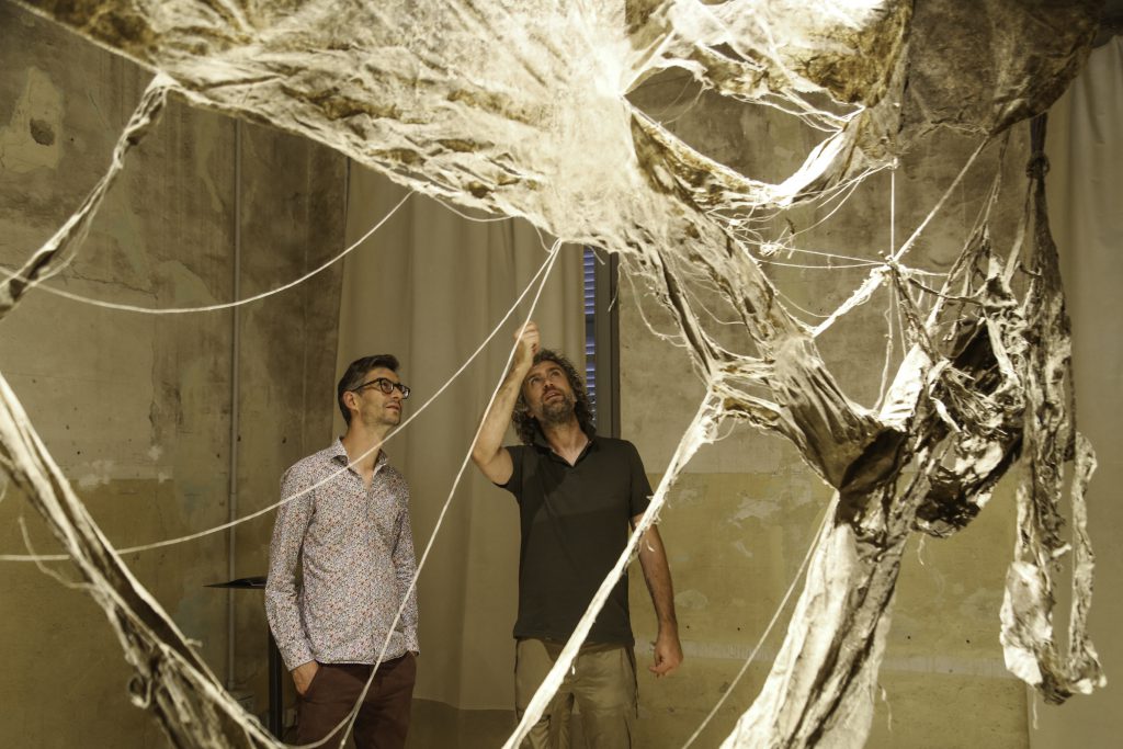 Nella prima sala troneggia una grande installazione di Naturografia, una tela che l’artista espone dopo tre anni parzialmente interrata, nell’Appennino toscano. Come afferma Ghezzi, in quest’opera è evidente il suo “interesse nei confronti dell’impermanenza: il tessuto appare parzialmente degradato e mancante, parte dello stesso è infatti tornato al suolo, al ciclo naturale della trasformazione della materia, secondo un processo di cambiamento di stato e biodegradazione”.