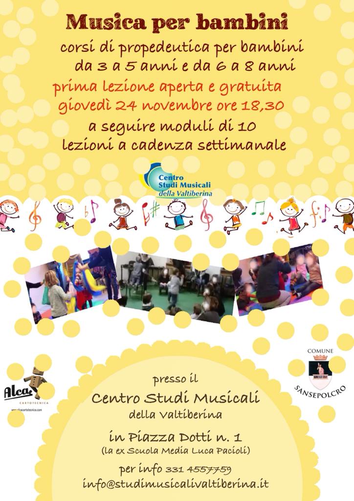 Scuola convenzionata con il Comune di Sansepolcro e il Conservatorio di Perugia) Giovedì 24 novembre alle ore 18,30 presso la sede del Centro Studi Musicali della Valtiberina in piazza Dotti 1 (1° piano), si terrà una lezione aperta gratuita che inaugurerà i corsi di Propedeutica Musicale rivolti a bambini fino a 8 anni di età divisi in 2 fasce, da 3 a 5 anni e da 6 a 8 anni. I corsi che hanno l’intento di accostare i bambini in maniera precoce al mondo dei suoni e della musica attraverso attività ludiche ma mirate allo sviluppo della sensibilità, della percezione e della conoscenza del linguaggio e degli strumenti musicali, saranno articolati in moduli di 10 incontri a cadenza settimanale ripetibili.Vi aspettiamo, sarà anche un’occasione per conoscere la nostra scuola e le nostre numerose attività!