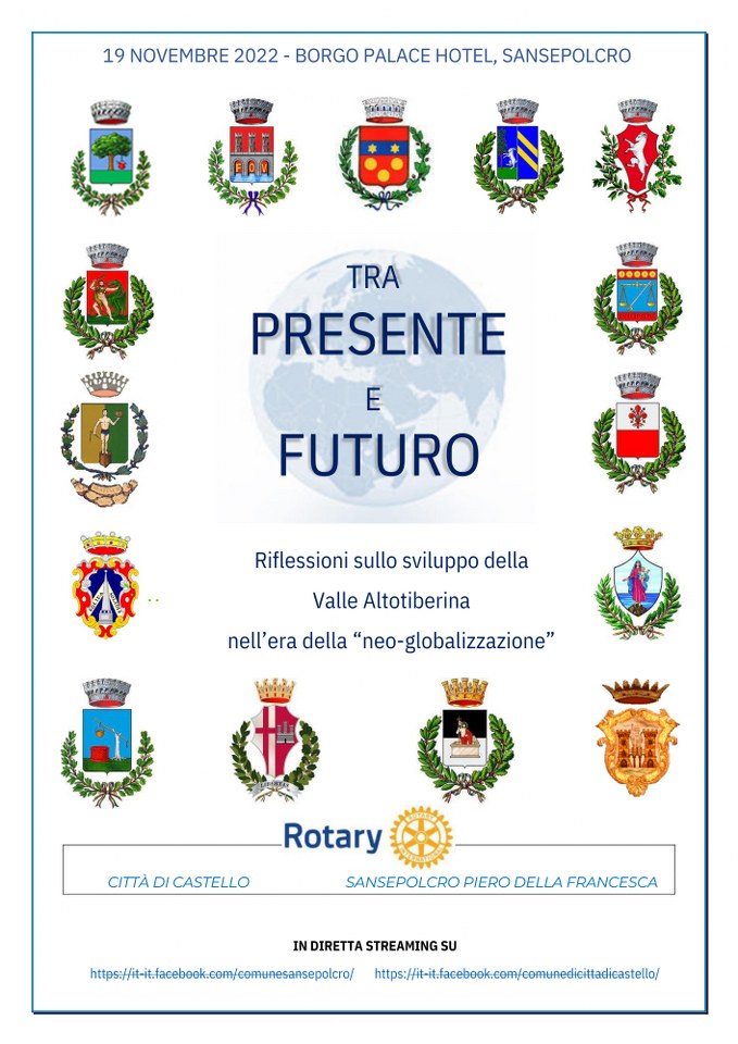 “Tra presente e futuro. Riflessioni sullo sviluppo della valle Altotiberina nell’era della neo globalizzazione”. E’ il titolo del convegno organizzato dai Rotary Club di Sansepolcro e Città di Castello per la mattinata di sabato 19 novembre a partire dalle 8.30. Un autentico focus sullo stato di salute del territorio e sulle sue potenzialità di crescita, i cui lavori sono programmati nella cornice del Borgo Palace Hotel di Sansepolcro.