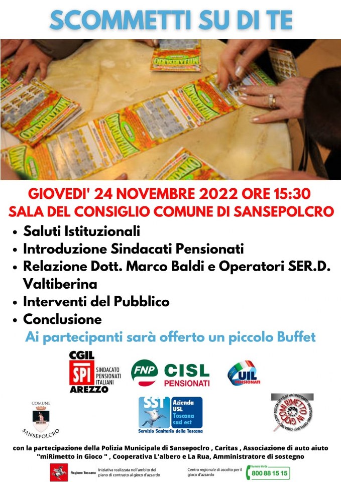 scuole, popolazione generale e popolazione adulta /anziana . “In particolare sul target della popolazione anziana – commenta Marco Baldi- coordinatore del servizio dipendenze della Valtiberina- abbiamo condiviso con i Sindacati Pensionati delle tre sigle l’utilità di un evento che mettesse a conoscenza i cittadini da una parte dei rischi e dall’altra della rete di opportunità di aiuto presente nella zona. Il progetto “non per azzardo ma per vita “dei Servizi Dipendenze della Asl Sud Est , coordinati dal dottor Marco Becattini e finanziato dalla Regione Toscana, intreccia – nelle varie declinazioni dei territori – una rete di realtà locali impegnate nello sviluppo del pensiero critico dei cittadini, rispetto ad un’offerta sempre maggiore di giochi d’azzardo che possono essere svolti sia in presenza che on line. Tale rete ha inoltre l’obiettivo di far conoscere le possibilità di aiuto a chi si è trovato imprigionato nella dipendenza da gioco d’azzardo”. Il disturbo è curabile e guaribile, ma è importante una diagnosi precoce che permetta un pronto accesso alle cure specialistiche riducendo le sue complicanze economiche, sociali, familiari, lavorative. Il Servizio Dipendenze In Valtiberina ha un ambulatorio dedicato al Gioco D’azzardo dove si effettuano cure cliniche multiprofessionali ( Medico, infermiere, Psicologo, As. Sociale, Educatore ) e si attivano le collaborazioni con la rete di sostegno territoriale.