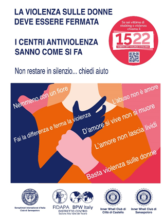In occasione della Giornata internazionale per l’eliminazione della violenza contro le donne 2022, il Soroptimist Club di Sansepolcro, la FIDAPA Alta Valle del Tevere e gli Inner Wheel Club di Sansepolcro e Città di Castello, al fine di mettere in atto un’azione di divulgazione e sensibilizzazione rivolta alle comunità della Valtiberina Toscana e Umbra, hanno realizzato dei sacchetti che riportano la seguente grafica. I sacchetti saranno consegnati alle farmacie della Valtiberina Toscana ed Umbra che, a far data dal 20 novembre p.v. e fino ad esaurimento, li utilizzeranno per la distribuzione dei farmaci ai loro clienti. Le stesse farmacie potranno partecipare alla campagna elargendo un contributo economico da devolvere ai Centri Antiviolenza del territorio.
