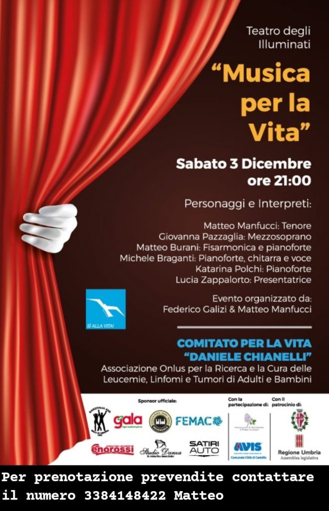Si tratta di un evento con finalità benefiche organizzato da, Federico Galizi e Matteo Manfucci, in onore dell’Associazione “Comitato per la Vita Daniele Chianelli” Associazione Onlus per la ricerca e la cura delle leucemie, tumori e linfomi di adulti e bambini. Il ricavato del concerto sarà devoluto interamente all’ampliamento del residence, che sta prendendo sempre più vita. “Tutte le attività del Comitato – spiegano Galizi e Manfucci – sono nate e vivono grazie al contributo di tutte le persone che credono, amano, sognano, ed hanno una speranza. Oltre che far passare una piacevole serata in armonia, con questo evento quello che vogliamo trasmettere a Città di Castello, in uno scenario bellissimo quello del Teatro degli Illuminati, é soprattutto sensibilizzare le persone all’importanza di quello che fa quotidianamente il Comitato, la forza, la speranza, la perseveranza, la gioia di vivere che nutrono soprattutto i pazienti anche nei periodi più tristi e dolorosi della malattia”. “Il merito va a tutti coloro che hanno reso possibile l’organizzazione dell’evento – concludono – che credono nel progetto ma soprattutto credono nel Comitato.  Si ringrazia l’amministrazione comunale, l’assemblea legislativa Regione Umbria, gli sponsor ufficiali e tutti gli artisti e collaboratori che parteciperanno. Non mancate. Vi aspettiamo numerosi per farvi vivere una serata indimenticabile,  un ricordo, che porterete sempre con voi”. Il sindaco Luca Secondi, nel sottolineare l’importanza dell’evento e ringraziare gli organizzatori ha precisato come “Città di Castello con le straordinarie associazioni di volontariato sempre in prima linea ancora una volta da dimostrazione della grande umanità e senso di solidarietà che la caratterizza da tempo”. Costo biglietto unico 10€ e 5 € fino a 10 anni. I biglietti si potranno acquistare presso biglietteria Teatro degli Illuminati Città di Castello, Sabato 3 Dicembre dalle ore 19:00 alle ore 21:00: