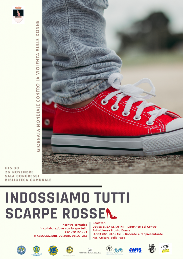 SANSEPOLCRO – Sabato 26 novembre, nella sala conferenze della Biblioteca Comunale di Sansepolcro si svolgerà l’incontro “Tutti indossiamo scarpe rosse” in collaborazione con lo sportello Anti Violenza di Sansepolcro e Arezzo.