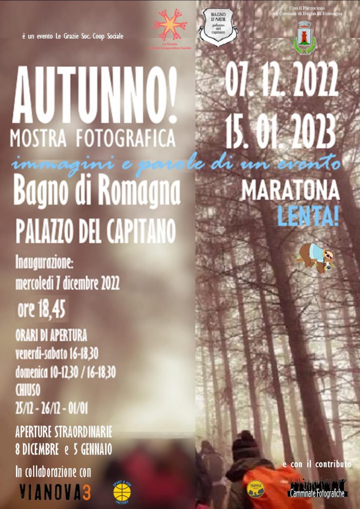 Bagno di Romagna – mercoledì 7 dicembre alle 18.45 a Palazzo del Capitano inaugura la seconda esposizione della rassegna “Bagno d’arte” dal titolo “Autunno!”, esposizione fotografica frutto dell’evento “Maratona lenta”, che si è svolto a Bagno di Romagna domenica 13 novembre.  L’evento ha visto coinvolte molte persone e stimolato lo scatto fotografico dei partecipanti durante il tragitto in cammino lungo i sentieri del nostro Appennino