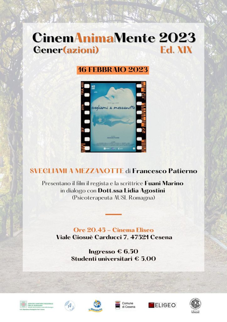 CESENA – Nuovo appuntamento con la rassegna CinemAnimaMente dedicata quest’anno al tema ‘Generazioni’. Giovedì 16 febbraio, alle ore 20.45, al Cinema Eliseo sarà proiettato il film ‘Svegliami a Mezzanotte’ di Francesco Patierno. Il regista dialogherà con la dott.ssa Lidia Agostini, psicoterapeuta di AUSL Romagna. Presente anche la scrittrice Fuani Marino autrice del libro da cui è tratto il film.