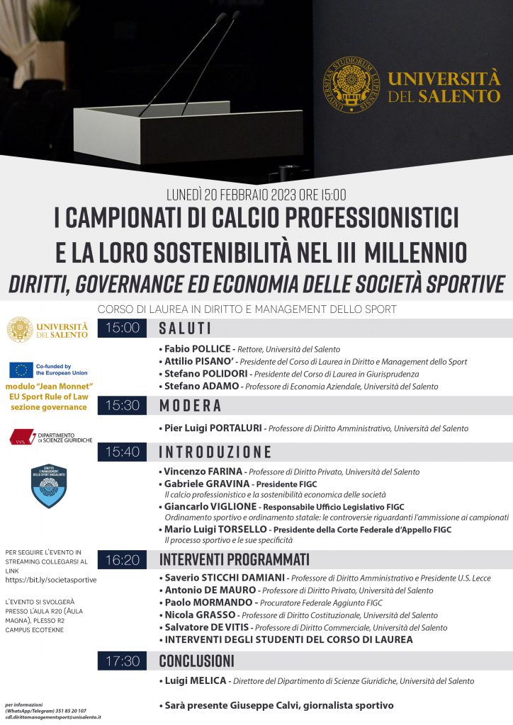 UNIVERSITA’ DEL SALENTO – LECCE – Il 20 Febbraio prossimo, presso l’Aula Magna dell’edificio R2, situato nel Campus Ekotekne, alle ore 15.30, il Corso di laurea in Diritto eManagement dello sport, afferente al Dipartimento di ScienzeGiuridiche dell’Università del Salento, Diritti, Governance ed Economia delle società sportive. Università del Salento Dipartimento di Scienze Giuridiche Corso di laurea in Diritto e Management dello sport Presentano il convegno I Campionati di calcio professionistici e la loro sostenibilità nel II Millennio. Diritti, Governance ed Economia delle società sportive 20 Febbraio 2023 Aula Magna dell’edificio R2, situato nel Campus Ekotekne (Via Lecce-Monteroni) alle ore 15.30