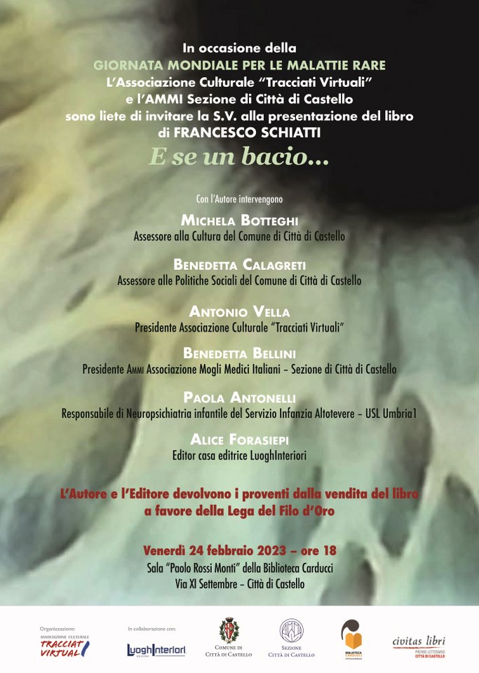 In occasione della Giornata Mondiale delle Malattie Rare, LuoghInteriori ha voluto organizzare un evento dedicato alla presentazione del romanzo di Francesco Schiatti E se un bacio…L’iniziativa, realizzata in collaborazione con il Comune di Città di Castello, l’Associazione Mogli Medici Italiani sezione di Città di Castello e il Premio Letterario “Città di Castello” si svolgerà venerdì 24 febbraio nella splendida Biblioteca Comunale Carducci di Città di Castell0