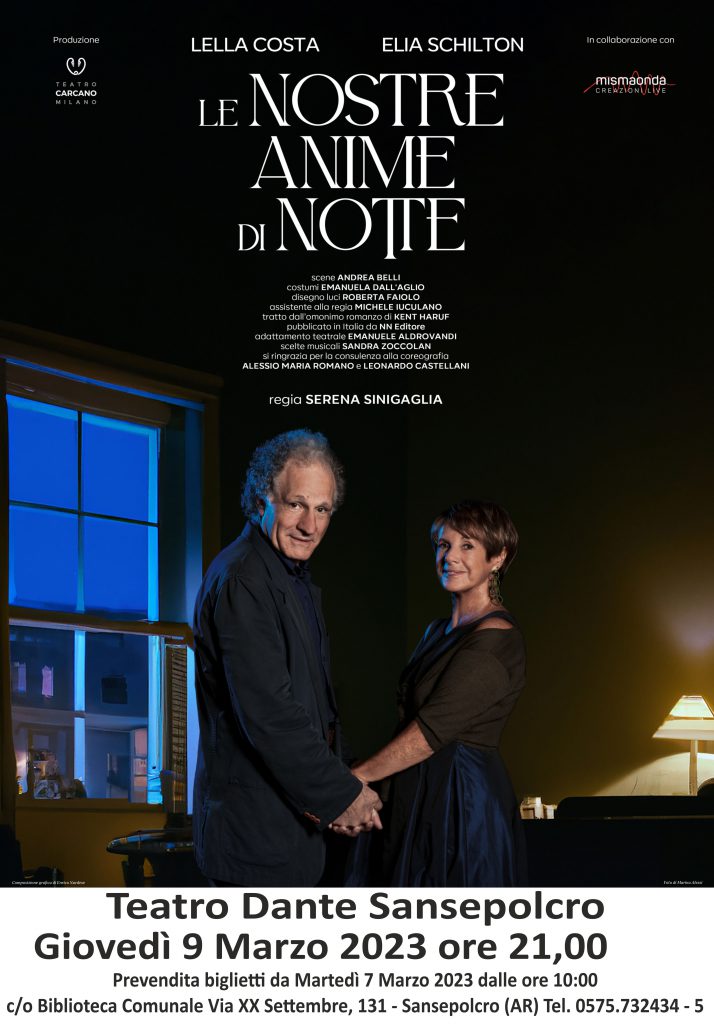 SANSEPOLCRO – Penultimo appuntamento con la Stagione Teatrale. Giovedì 9 marzo il palcoscenico del Dante vedrà protagonisti Lella Costa ed Elia Schilton che porteranno in scena “Le nostre anime di notte, spettacolo diretto da Serena Sinigaglia e tratto dall’omonimo romanzo di Kent Haruf. Addie e Louis sono due anziani vedovi vicini di casa che si conoscono da anni. Addie, dal giorno della scomparsa del marito, ha serie difficoltà ad addormentarsi da sola e propone a Louis di andare da lei a dormire per poter condividere con qualcuno quell’intimità notturna fatta soprattutto di chiacchierate nel buio prima di cedere al sonno. Lella Costa ed Elia Schilton incarnano la dolcezza e la poesia di questa storia che unisce due anime tormentate e refrattarie alla solitudine.