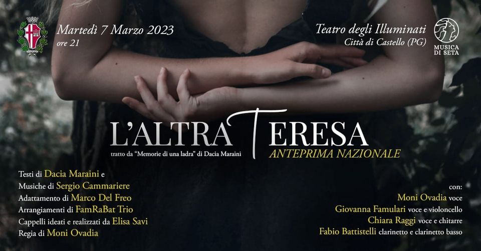 regista e protagonista dello spettacolo in anteprima nazionale “L’altra Teresa” con testi di Dacia Maraini e musiche di Sergio Cammariere. Prenotazioni aperte da oggi, lunedì 27 febbraio 2023 allo 075 8529323 dalle 10.00 a 12.00.Lo spettacolo con la regia di Moni Ovadia, che ne è protagonista, vedrà la partecipazione di Fabio Battistelli, interprete musicale, Giovanna Famulari, voce e violoncello, Chiara Raggi, voce e chitarre. Lo spettacolo è un adattamento di “Memorie di una ladra” di Dacia Marini, che firma il testo. Musiche originali di Sergio Cammariere.Il botteghino apre dalle ore 17.00 alle ore 19.00 di lunedì 6 marzo e il giorno dello spettacolo dalle 19.30 in poi. Prezzo del biglietto: 15 euro platea, I e II ordine tranne palchi laterali; 10 euro I e II ordine laterali e tutti gli altri posti a disposizione.