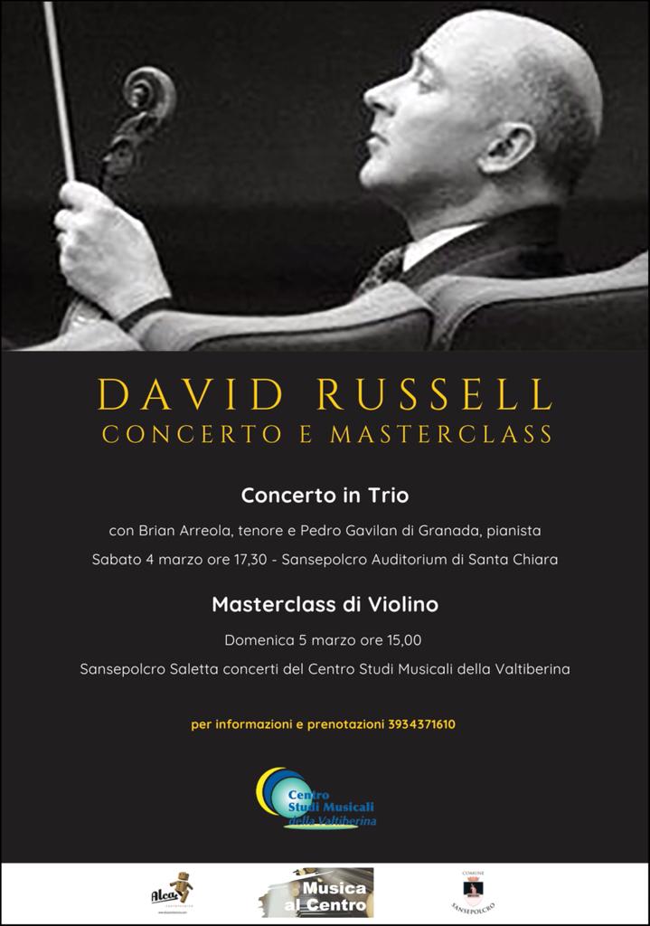 SANSEPOLCRO – Musica al Centro, il ciclo di eventi organizzato dal Centro Studi Musicali della Valtiberina, si ripropone nel prossima fine settimana con un doppio appuntamento di grande rilievo che vede protagonista il noto violinista americano David Russell il quale, sabato 4 marzo alle 17,30 presso l’Auditorium di Santa Chiara, si esibirà in un concerto dal titolo “Echoes of Al- Andalus” assieme al tenore Brian Arreolae e il pianista Pedro Gavilan di Granada, e domenica 5 marzo a partire dalle ore 15 presso la sede del Centro Studi Musicali della Valtiberina, terrà una masterclass di violino completamente gratuita sia per gli uditori che per gli allievi effettivi che potranno proporre al M° Russell esecuzioni di brani del loro repertorio da approfondire.Si tratta di due occasioni irripetibili che consentiranno di entrare in contatto con un musicista di grande esperienza internazionale sia in ambito concertistico che didattico.