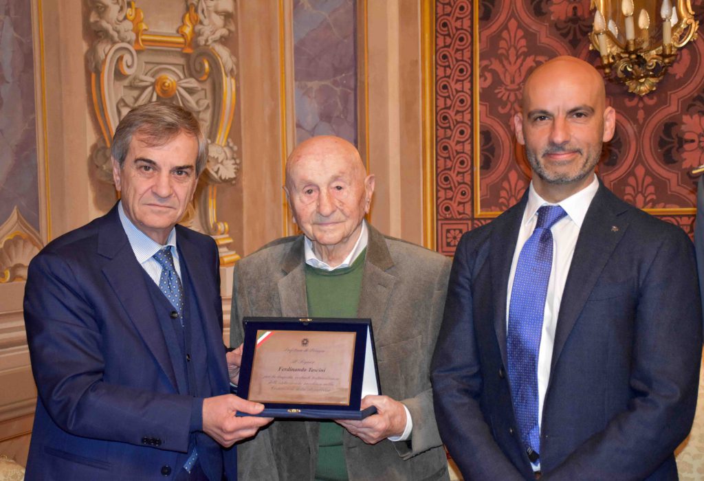 “Al signor Ferdinando Tascini per la limpida, costante testimonianza delle virtù civiche racchiuse nella Costituzione della Repubblica”. E’ questa la dedica impressa nella targa listata con il tricolore che il Prefetto di Perugia, Armando Gradone, ha consegnato nella sede della Prefettura in Piazza Italia, nel corso di una sentita cerimonia, a Ferdinando Tascini, che lo scorso 28 dicembre ha tagliato il traguardo dei 100 anni, ultimo “carceriere” di Mussolini nella prigionia a Campo Imperatore sul Gran Sasso, vero e proprio simbolo di eventi storici, sostenitore convinto dei valori di libertà e democrazia racchiusi nella Costituzione della Repubblica Italiana. All’incontro oltre ai figli, al sindaco, Luca Secondi, ha preso parte anche una nutrita e prestigiosa delegazione di rappresentanti dell’Arma dei Carabinieri, della Guardia di Finanza e della Questura di Perugia: il Comandante della Legione Carabinieri, generale di brigata, Gerardo Iorio, il Comandante Provinciale, Colonello, Stefano Romano, il Comandante Gruppo Regionale Guardia di Finanza, generale di brigata, Alberto Reda, il Comandante Provinciale, colonnello, Antonella Casazza ed il Vice-Questore, Alessandro Drago. “L’elemento che più colpisce di questa bellissima testimonianza di vita è il desiderio di guardare avanti con fiducia, la voglia di costruire il proprio futuro, creare una famiglia serena, coltivare il proprio lavoro da seminatore: il signor Tascini ha fatto una semina, anno dopo anno, passo dopo passo per costruire un paese migliore”, ha dichiarato il Prefetto Gradone prima del conferimento della targa facendo riferimento allo straordinario messaggio che attraverso la Costituzione ha lanciato in particolare alle giovani generazioni. “Con quelle belle parole credo abbia voluto dire questo ai nostri ragazzi. Guardate che nella Costituzione ci sono i valori che tengono insieme una nazione, di solidarietà, dei diritti e dei doveri dei cittadini. Lui è un testimone di quei valori che ha trasmesso alla sua bella famiglia, alla sua comunità che giustamente il sindaco di Città di Castello ha evidenziato in maniera pubblica”, ha concluso il Prefetto Armando Gradone. Il testimone della storia e custode dei principi e valori della carta costituzionale, a stento ha trattenuto la commozione e soddisfazione per aver avuto l’onore di vivere momenti indimenticabili in quella prestigiosa sede dello Stato: “nella mia vita non avrei mai immaginato di essere ricevuto da Sua Eccellenza il Prefetto e dai massimi esponenti delle forze dell’ordine e di Polizia, una giornata indimenticabile accanto alla mia famiglia, al sindaco, che andrà a segnare la mia vita come lo hanno segnato quei giorni in cui la storia mi ha chiamato ad essere in quei luoghi”, ha dichiarato Tascini. Dal sindaco, Luca Secondi parole di gratitudine al Prefetto di Perugia e alle forze dell’ordine e di Polizia per aver celebrato un cittadino simbolo della città, orgoglio di una intera comunità per i valori di vita positivi e solidali che trasmette.
