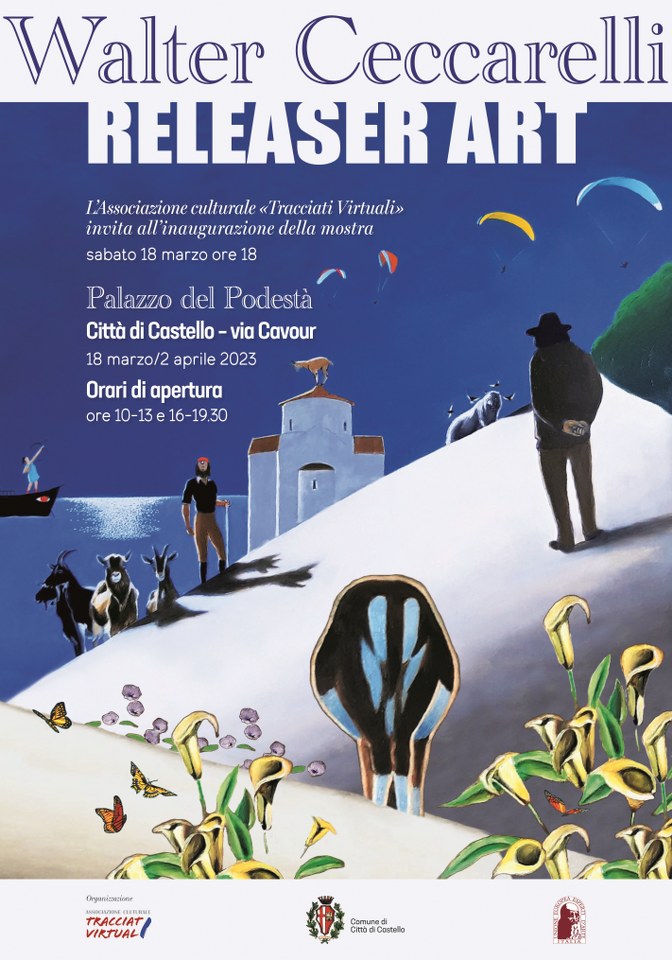 Sabato 18 marzo alle 18 presso lo spazio espositivo del Palazzo del Podestà a Città di Castello si inaugura la mostra RELEASER ART dell’artista romano Walter Ceccarelli. Ceccarelli è architetto, pittore, storico dell’arte, cineasta e ornitologo. Fra i suoi molteplici interessi un posto particolare lo occupa la ricerca e lo studio di opere d’arte e di architetture dai contenuti oscuri. È stato l’organizzatore, il direttore e il supervisore artistico della I e II Rassegna Internazionale di Arte Animalista, promossa dalla Comunità europea nell’ambito del programma “Cultura 2000”.