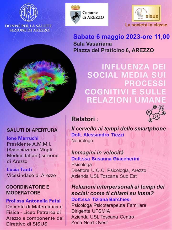 L’iniziativa dell’AMMI intende proprio sensibilizzare sul tema dell’uso corretto di questi strumenti rivolgendosi in particolar modo ai giovani veri protagonisti di questo mondo virtuale”. E’ il commento del vice sindaco Lucia Tanti all’iniziativa “Influenza dei social media sui processi cognitivi e sulle relazioni umane”, in programma il prossimo 6 maggio alle ore 11:00 presso la Sala Vasariana e organizzata dall’AMMI – Associazione Mogli Medici Italiani sezione di Arezzo. L’evento, rivolto agli studenti delle scuole medie superiori e dei licei musicale, classico e scientifico e ai loro insegnanti, avrà come relatori numerosi specialisti tra i quali neurologi, psicologi, psicoterapeuti, impegnati in lezioni frontali. Spazio anche al dibattito con gli studenti, che avranno modo di comunicare le loro esperienze personali e confrontarsi con i relatori e con gli insegnanti. L’evento ha il patrocinio del Comune di Arezzo.