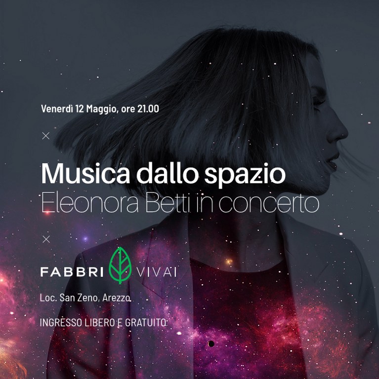 AREZZO – Presentazione del nuovo album a Fabbri Vivai Fabbri Vivai organizza per venerdì 12 maggio, dalle ore 21.00, presso la propria sede in Loc. San Zeno, una serata dedicata alla musica ed allo spazio con ospite la cantante Eleonora Betti.
