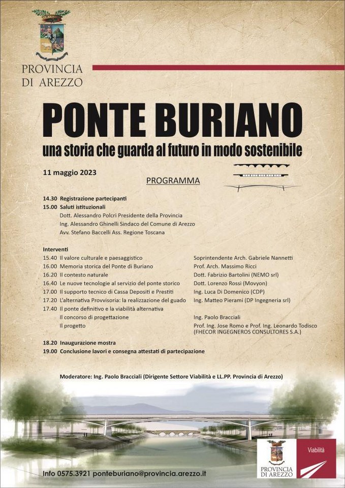 AREZZO – Si svolgerà giovedì 11 maggio dalle ore 15 presso la Sala dei Grandi del Palazzo della Provincia, il convegno organizzato dal Presidente della Provincia di Arezzo Alessandro Polcri, dal titolo : “Ponte Buriano, una storia che guarda al futuro in modo sostenibile”. Interverranno tra gli altri il Sindaco del Comune di Arezzo Alessandro Ghinelli, l’Assessore Stefano Baccelli della Regione Toscana, il Soprintendente Gabriele Nannetti. Al termine, intorno alle ore 18, è in programma l’inaugurazione presso l’Atrio d’Onore della mostra del concorso di progettazione del Ponte definitivo.