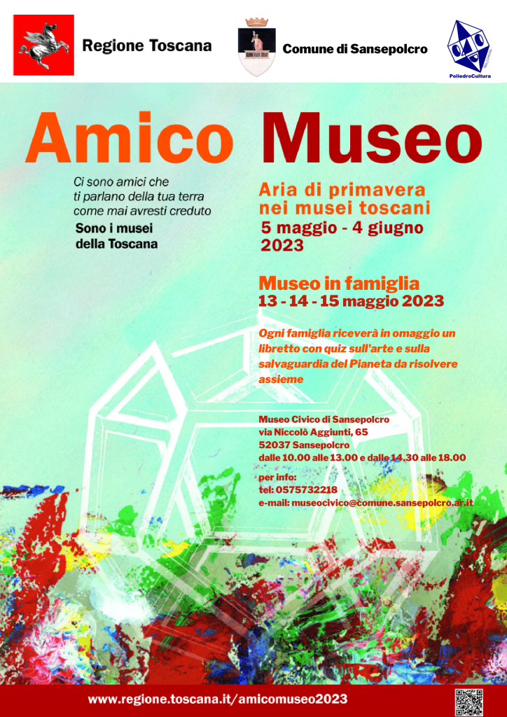 Il 13-14 e 15 maggio sarà possibile dalle 10 alle 13e dalle 14.30 alle 18, prendere parte all’iniziativa Museo in Famiglia, che vede protagonista il nostro Museo Civico di Sansepolcro. Si tratta di appuntamenti dedicati proprio alle famiglie che vogliono vivere luoghi di cultura con iniziative dedicate. Ogni famiglia infatti, con il biglietto per l’entrata al museo riceverà in omaggio un libretto con dei quiz sull’arte e sulla salvaguardia del Pianeta da risolvere assieme. Un modo per conoscere meglio gli aspetti culturali e ambientali di ogni territorio. L’iniziativa è in collaborazione con il comune di Sansepolcro e Poliedro Cultura.
