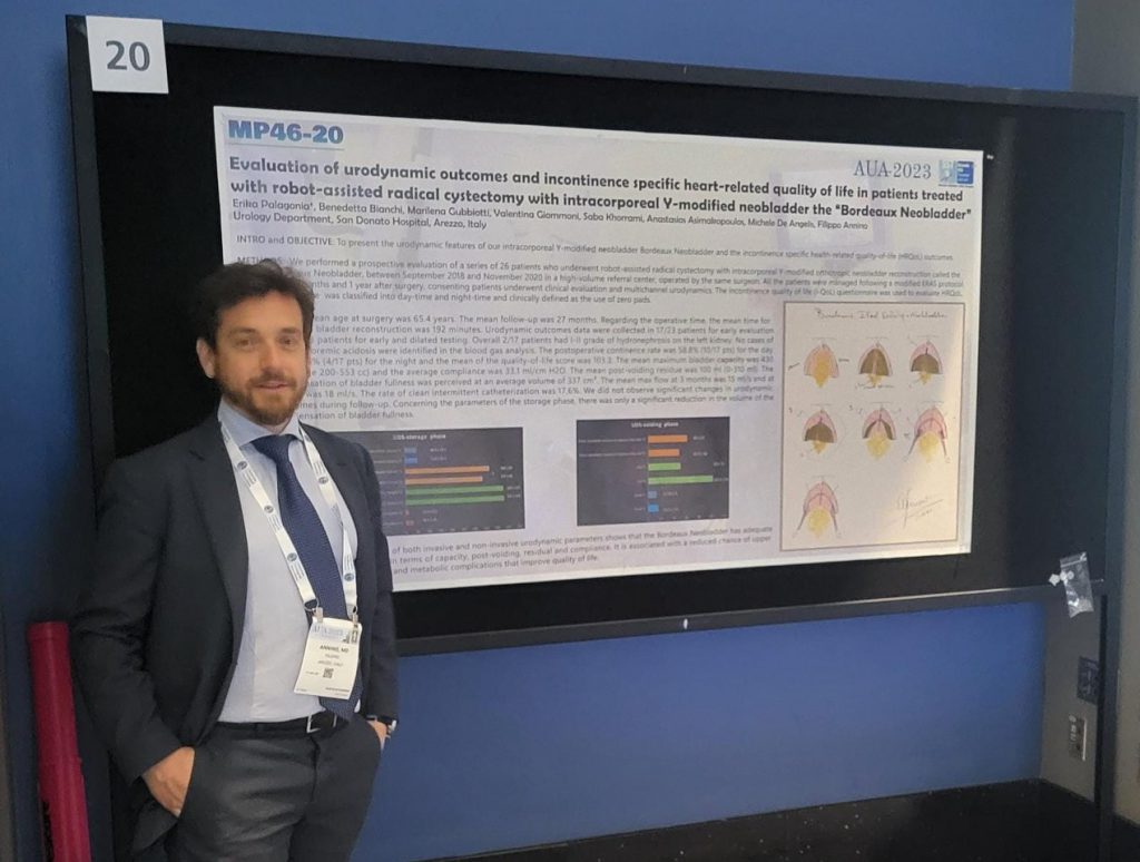 L’urologia dell’ospedale San Donato di Arezzo diretta dal dott.Michele De Angelis è tra le prime in Toscana per volumi di attività robotica tanto che un importante riconoscimento è arrivato anche da oltre oceano poiché lo studio sulla ricostruzione vescicale in robotica, portato avanti dal reparto e condotto dal dott.Filippo Annino, direttore della UOS di Urologia Robotica dell’ospedale S. Donato è stato selezionato per essere presentato nei giorni scorsi all’Aua uno dei più importanti convegni a livello mondiale di urologia che si è tenuto a Chicago.