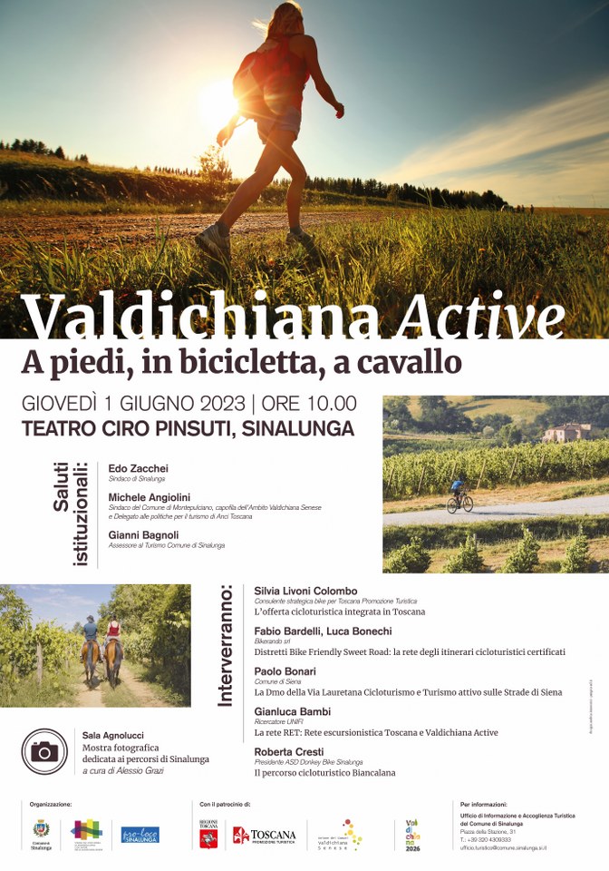 Tutti i percorsi dispongono di segnaletica, portali dedicati, app e materiale promozionale cartaceo messi a disposizione di tutti coloro che vogliono entrare a contatto con l’essenza del territorio. I primi portavoce di questa importante offerta turistica del territorio sono gli operatori turistici che, oltre ad essere sempre aggiornati e informati, devono possedere tutti gli strumenti necessari a promuovere e valorizzare gli itinerari di turismo lento. Ed è proprio con questo obiettivo che nasce il convegno “Valdichiana Active: a piedi, in bicicletta, a cavallo” che si svolgerà a Sinalunga presso il Teatro Comunale Ciro Pinsuti in Via S. Martino n. 17 il giorno giovedì 1 Giugno 2023 alle ore 10:00. All’incontro organizzato dal Comune di Sinalunga in collaborazione con la Strada del Vino Nobile di Montepulciano e dei Sapori della Valdichiana Senese e la Proloco di Sinalunga, interveranno, dopo i saluti istituzionali del sindaco di Sinalunga Edo Zacchei, il sindaco di Montepulciano capofila dell’Ambito Valdichiana Senese e delegato alla politiche per il turismo di Anci Toscana Michele Angiolini, l’assessore al turismo Gianni Bagnoli, Silvia Livoni Colombo Consulente strategica bike per Toscana Promozione Turistica, Fabio Bardelli, Luca Bonechi Bikerando srl – Distretti Bike Friendly Sweet Road: la rete degli itinerari cicloturistici certificati, Paolo Bonari per il Comune di Siena, Gianluca Bambi Ricercatore UNIFI e Roberta Cresti Presidente ASD Donkey Bike Sinalunga che illustrerà il percorso Biancalana. In occasione di questo appuntamento sarà allestita una mostra fotografica dedicata ai percorsi di Sinalunga a cura di Alessio Grazi.