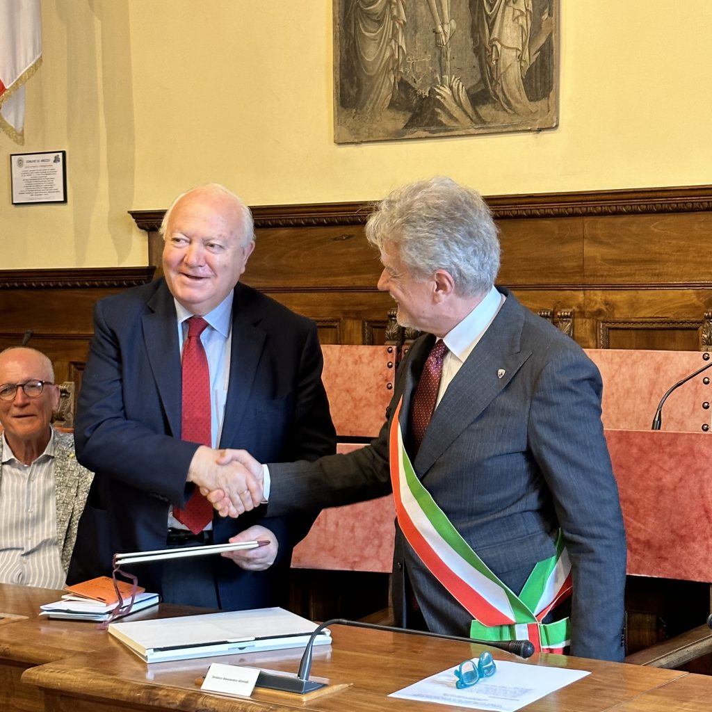 AREZZO – Presenti le Autorità istituzionali civili, militari e religiose Questa mattina a Palazzo Cavallo nella Sala del Consiglio Comunale il Sindaco Alessandro Ghinelli ha ricevuto il Vice Segretario ONU e Alto Rappresentante per l’Alleanza tra le Civiltà, Miguel Angel Moratinos alla presenza delle Autorità istituzionali civili, militari e religiose. Un colloquio molto cordiale nel corso del quale il Sindaco ha sottolineato l’identità di Arezzo come città di pace. A sua volta il Vice Segretario Moratinos ha speso parole di elogio per la città e per l’accoglienza ricevuta, e ha sottolineato il valore della pluralità e l’importanza del dialogo per la costruzione della pace. A Moratinos, il Sindaco Ghinelli ha fatto dono di una raccolta di litografie numerate di Venturino Venturi.