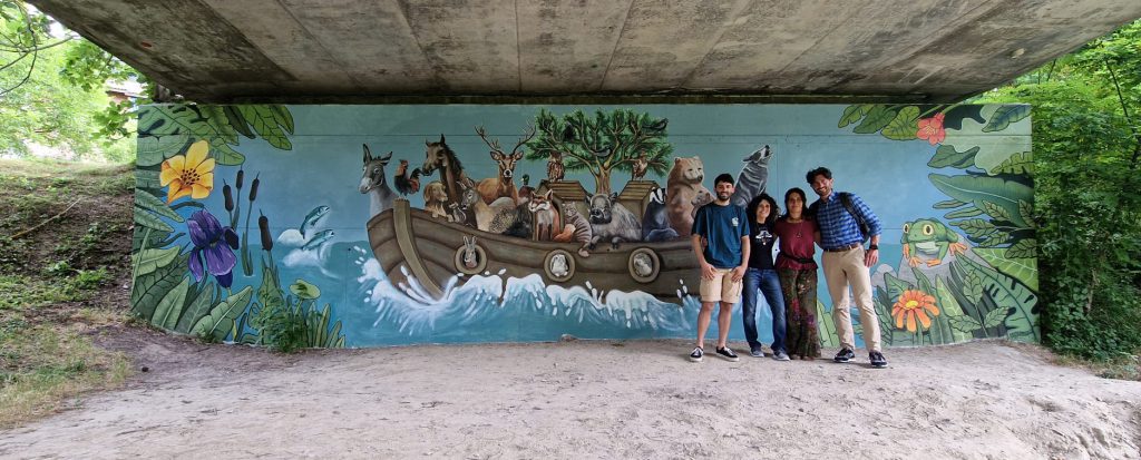 Usando il metodo dell’immaginazione attiva questo gruppo di cittadini attivi ha trasformato un luogo degradato in un angolo accogliente ed ha riqualificato 5 panchine dei giardini pubblici di Via Gramsci, rendendole attrattive ed inclusive. La realizzazione del murales ha avuto ad oggetto la parete della colonna di destra del ponte di via Gramsci. Su questa parete, è stata realizzata con la tecnica del murales un’immagine stilizzata dell’Arca di Noè con animali tipici del nostro territorio delle dimensioni di 30 metri quadri. Oltre alla raffigurazione è stato particolarmente bello anche l’approccio di impostazione adottato: su richiesta di Simonetta, Elisabetta e Giacomo hanno realizzato alcune bozze di disegni, che sono state presentate ad un gruppo di 12 ragazze ed 1 ragazzo per un coinvolgimento di idee e per la condivisione del progetto.Scelto il disegno da realizzare, mi hanno coinvolto per ricercare la condivisione dell’Amministrazione comunale, che ho fornito loro sia come apprezzamento dell’iniziativa che in termini di sostenimento dei costi dei materiali che sarebbero stati necessari.E’ così che i giovani ragazzi e ragazze insieme a Simonetta, Elisabetta, Giacomo e Beatrice, si sono cimentati nella realizzazione di questa bella opera decorativa e delle 5 panchine dei giardini della “Torretta”. Una volta portato a termine il progetto, ho sentito il dovere di ringraziare Simonetta, Elisabetta, Giacomo e Beatrice e con loro tutti i ragazzi e le ragazze che hanno partecipato a questo progetto, oltre alle loro famiglie, per aver coltivato un’iniziativa che ha come finalità fondamentale quella di educare nostri giovani sull’importanza e il rispetto del bene comune, ispirando consapevolezza tramite tematiche ambientali, sociali e culturali, e sottolineando il valore dell’appartenenza fondata sul senso civico, il gusto del bello, l’universalità e libertà di pensiero.