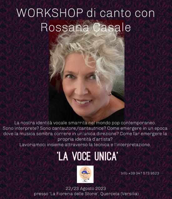 Aperte le iscrizioni Workshop di canto con Rossana Casale La Fioreria delle Storie 22-23 agosto Querceta (Lu) Sono aperte le iscrizioni per La voce unica workshop a numero chiuso di canto tenuto da Rossana Casale che si svolgerà martedì 22 e mercoledì 23 a La Fioreria delle Storie a Querceta (LU).