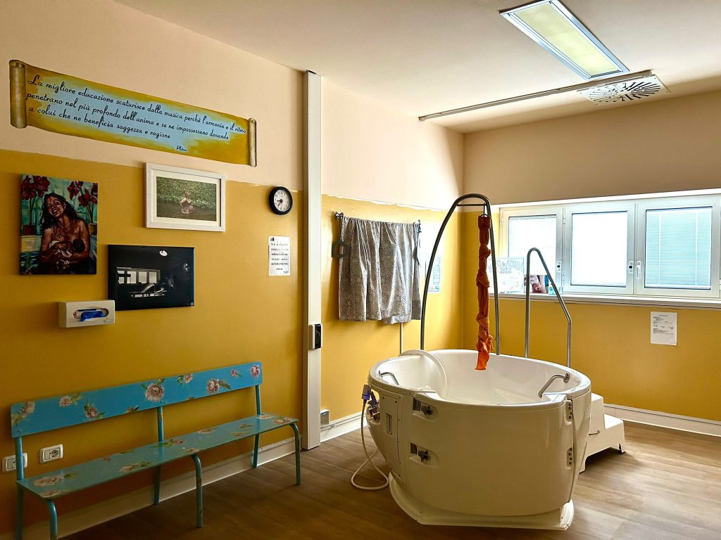 È dimostrato da numerosi studi che l’acqua calda favorisce il rilassamento corporeo ed il raggiungimento di una sensazione di benessere. È inoltre associata ad una riduzione del tempo del travaglio, aumento della dilatazione cervicale e comporta anche dei benefici nel neonato, in particolare lo aiuta a non disperare calore. La nuova vasca, dotata di porta, è ergonomica e permette quindi alla donna di assumere durante il travaglio la posizione che più le è comoda ed è inoltre dotata di dispositivo che permette la cromoterapia.