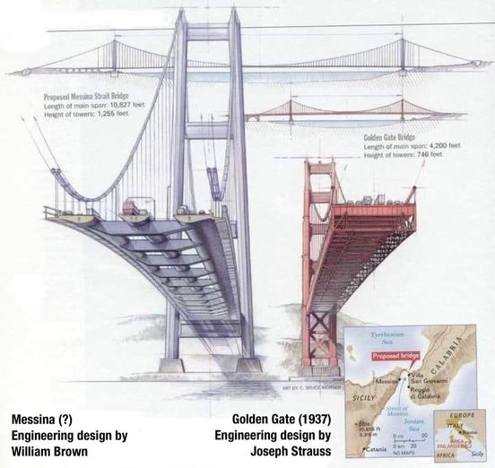 Confronto dimensionale in scala tra il vecchio Golden Gate e il nuovo Messina. Nel corso del secolo che separa le due opere, sono stati fatti passi avanti giganteschi nell’ambito dei ponti sospesi. Oggi le tecnologie sono molto più sofisticate e permettono di costruire ponti molto più grandi e – nonostante ciò – con prestazioni drasticamente superiori.