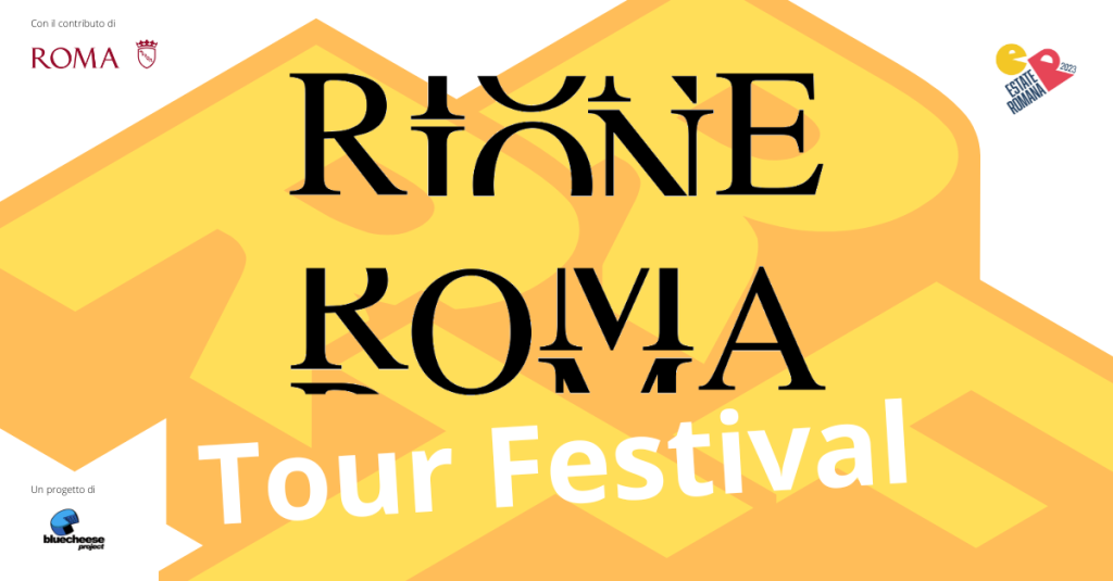 Dal 21 al 30 Agosto: 10 tour + 4 laboratori + 1 evento di arte partecipata + 1 installazione site specific + 1 tal RIONE ROMA Tour Festival Un progetto di Bluecheese Project Il progetto, promosso da Roma Capitale – Assessorato alla Cultura, è vincitore dell’Avviso Pubblico biennale “Estate Romana 2023-2024” curato dal Dipartimento Attività Culturali ed è realizzato in collaborazione con SIAE
