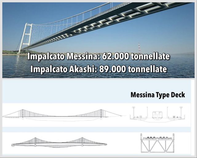 Pesa molto meno dei vecchi impalcati reticolari e – nonostante questo – ha prestazioni drasticamente superiori in caso di vento. Basti pensare che l’impalcato del ponte di Messina pesa meno di quello dell’Akashi nonostante la luce sia 3300 m contro 1991. Il segreto sta nell’aver suddiviso l’impalcato in tre cassoni indipendenti di modo che i vortici (di Von Karman) che si formerebbero su una lunghezza complessiva di 61 metri si spezzano in 3 vortici che reciprocamente tendono ad annullarsi nell’area di separazione tra cassoni contigui. Sono state condotte prove in diverse gallerie del vento ovunque nel mondo e tutte hanno confermato la bontà del progetto. Talmente buono che, ad esempio, il nostro ponte, a parità di condizioni di vento rispetto all’Akashi, si deforma lateralmente del 50% in meno nonostante la campata più lunga.