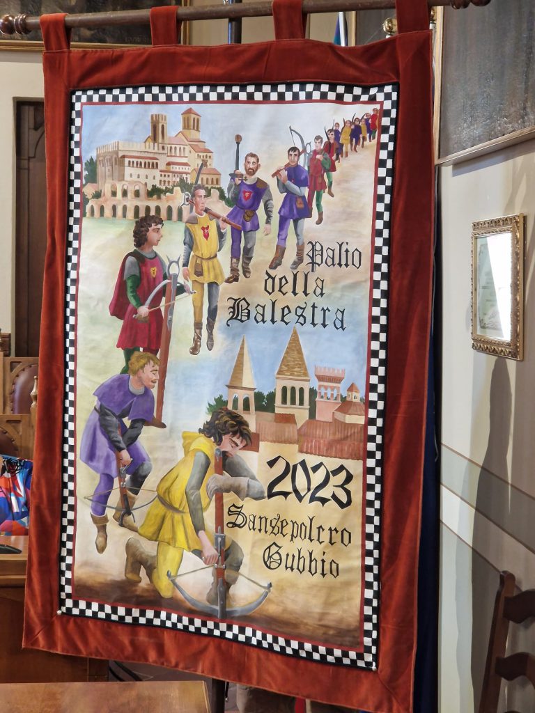 Presentato il 1 Settembre a Sansepolcro, nella sala del Consiglio Comunale in Palazzo delle Laudi, alla presenza del Sindaco Fabrizio Innocenti e degli assessori Francesca Mercati e Valeria Noferi, il drappo dipinto del Palio della Balestra 2023 che andrà alla Società vincitrice della storica competizione di balestra antica all’italiana che si disputerà domenica 10 settembre prossima. L’autrice è la pittrice francese Pascale Queval, classe 1951, nota a Sansepolcro soprattutto per essere stata moglie di Fausto Braganti, balestriere con varie competizioni disputate, con un secondo posto conquistato al Palio del 1978 e personaggio rappresentativo per essere appartenuto a varie associazione. Braganti, nato a Sansepolcro proprio in Palazzo delle Laudi, era stato insegnante di lettere italiane a Londra e poi essendo assunto da ALITALIA aveva finito per stabilirsi a Marblehead nel Massachusetts.
