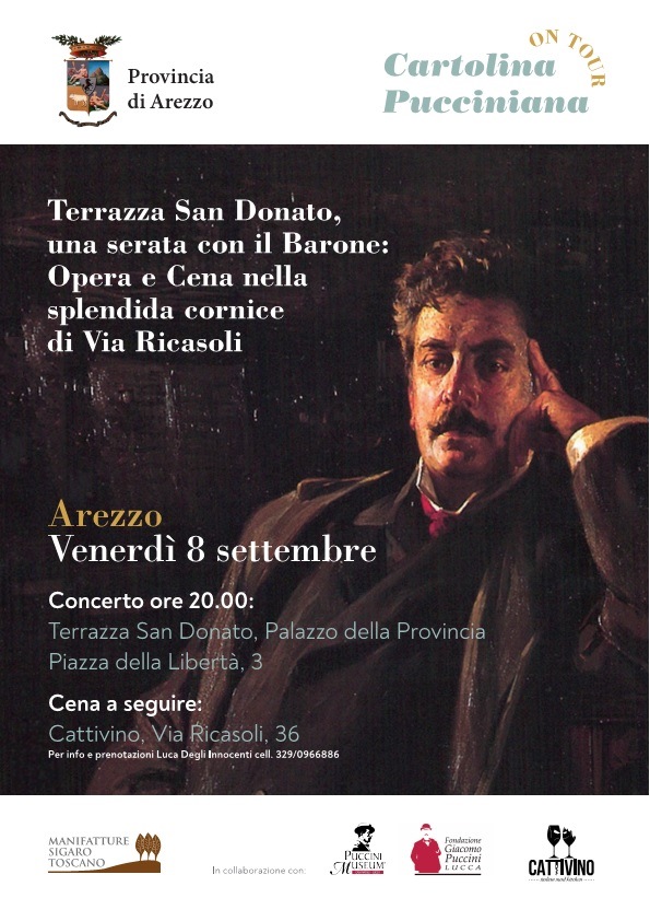 UN PALCOSCENICO A CIELO APERTO CON LE OPERE DI PUCCINI Venerdi 8 settembre alle 20 nella suggestiva Terrazza San Donato del Palazzo della Provincia di Arezzo, andranno in scena una selezione di arie tratte dalle opere del Maestro Giacomo Puccini. La serata fortemente voluta dal Presidente della Provincia Alessandro Polcri e dal Consigliere con delega alla cultura e turismo Simon Pietro Palazzo, è organizzata in collaborazione con la Fondazione Giacomo Puccini di Lucca, Puccini Museum Casa natale Lucca, e Manifatture Sigaro Toscano.