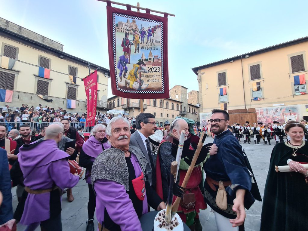 Dunque il Drappo disegnato da Pascal Queval, moglie di Fausto Braganti, non resta in città, ma non poteva essere altrimenti, il “Palio di Fausto”, così come lui, è nato per viaggiare, pur essendo indissolubilmente legato a Sansepolcro e la sua tradizione. Successo di pubblico, sia in piazza Torre di Berta per la disputa della gara, che per le vie del centro durante la sfilata del Corteo Storico. Molti i turisti, sia italiani che stranieri, seduti sugli spalti. Accanto al primo cittadino Fabrizio Innocenti, erano presenti anche l’Europarlamentare Susanna Ceccardi e l’Onorevole Tiziana Nisini. Tantissime persone hanno visitato anche il Mercato di Sant’Egidio, allestito in questi due giorni nel chiostro e nel loggiato della Cattedrale dall’Associazione Rinascimento nel Borgo. Onore e Gloria per i balestrieri di Gubbio, ma con la promessa di tornare a vincere nella prossima edizione del Palio.