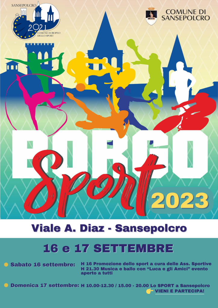 SANSEPOLCRO – Ritorna anche quest’anno l’appuntamento con “Borgo Sport”. L’evento, organizzato dal Comune di Sansepolcro, è in calendario per il prossimo fine settimana, sabato 16 e domenica 17 settembre, in viale Diaz a Porta Fiorentina. Una “due giorni” interamente dedicata alle realtà sportive del territorio, dove giovani e meno giovani potranno cimentarsi nella pratica delle diverse discipline, con strutture messe a disposizione dalle società e dalle associazioni sportive del Borgo.
