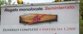 L’agenzia funebre è la Taffo, che offre i propri servizi con ironia del tipo, in questo periodo, “Sotto il sole non si respira? Funerale a 1250 euro e bara in omaggio”.
