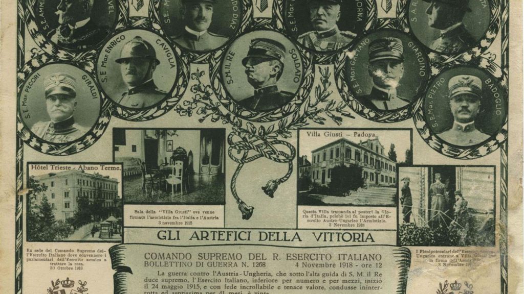 Il 4 novembre alle ore 15 tutte le operazioni di guerra cessarono e fu proclamata la fine della Grande Guerra. Armando Diaz emanò un bollettino che celebrava, non senza retorica, la vittoria sui “uno dei più potenti eserciti del mondo”.
