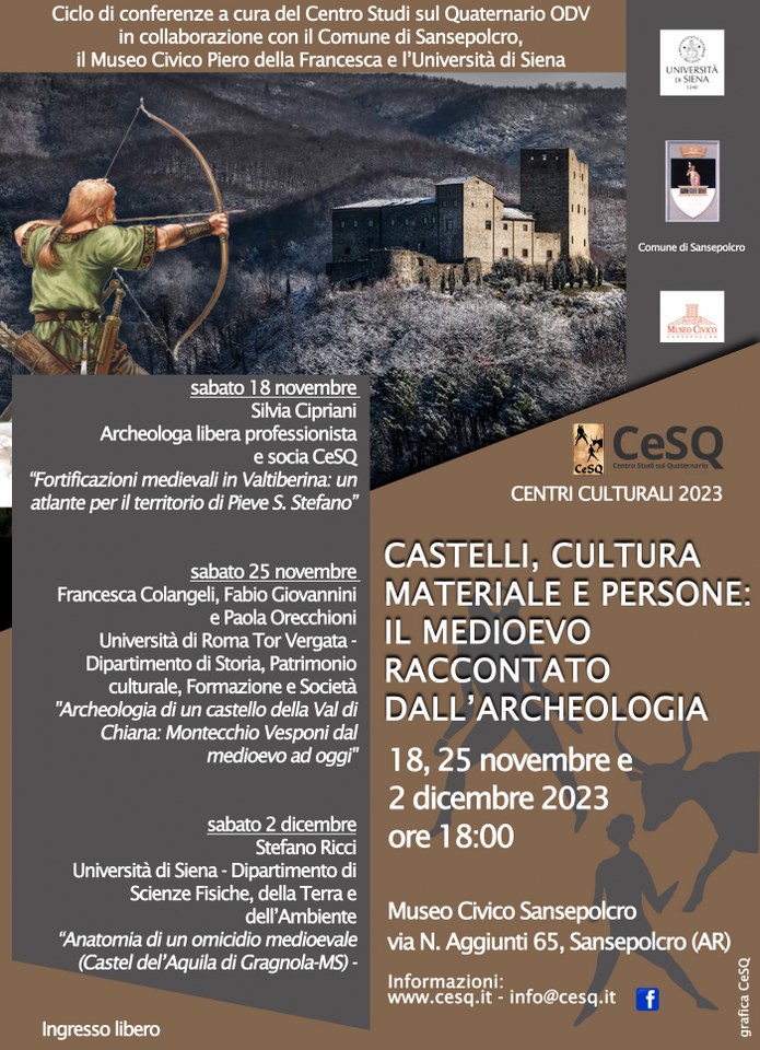 Anche quest’anno il CeSQ, Centro Studi sul Quaternario di Sansepolcro organizza una serie di conferenze denominate “Centri culturali”. Le relazioni hanno come oggetto l’archeologia del medioevo e si svolgeranno presso il Museo Civico di Sansepolcro. Tutte le conferenze sono ad ingresso gratuito. In allegato la locandina con date, titoli ed orari.