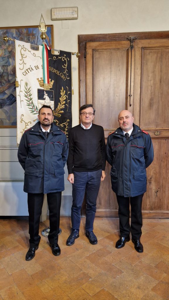 SANSEPOLCRO – Dal Valdarno, dove era Comandante della Stazione Carabinieri di Loro Ciuffenna, il Luogotenente Petruzzi arriva a Sansepolcro per dirigere la stazione Carabinieri territoriale. Originario di Città di Castello ha lavorato anche nelle province di Caserta e di Roma, dove ha trascorso buona parte del suo percorso professionale. Giunto a Sansepolcro, al comando della Stazione Carabinieri, si è recato a Palazzo delle Laudi con il Comandante di Compagnia, Capitano Carmine Feola, per incontrare il primo cittadino che ha dato il benvenuto al Luogotenente augurandogli buon lavoro, sottolineando l’importanza della collaborazione fra le istituzioni e le forze dell’ordine territoriali per il bene della città e dei cittadini.
