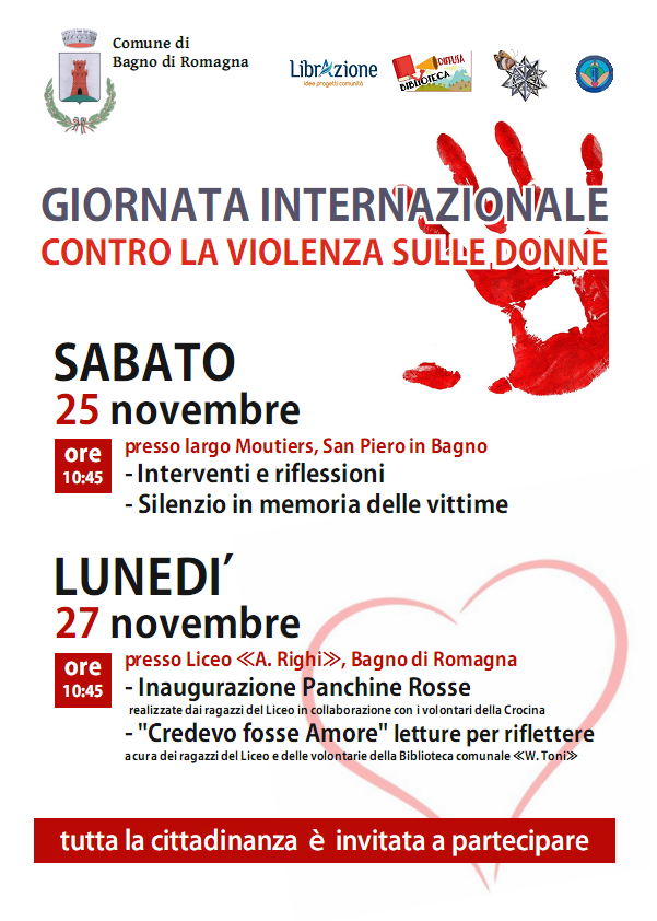 BAGNO DI ROMAGNA – manifestazione di Comunità. Vi scrivo con sincera sensibilità e senso di responsabilità per invitarVi alla manifestazione pubblica che abbiamo organizzato per il prossimo sabato 25 novembre, dalle 10.45 alle 11.45, a San Piero in Largo Moutiers per condividere un momento di riflessione sul tema del contrasto della violenza contro le donne e di raccoglimento per tutte le vittime di atti di discriminazione e delittuosi.