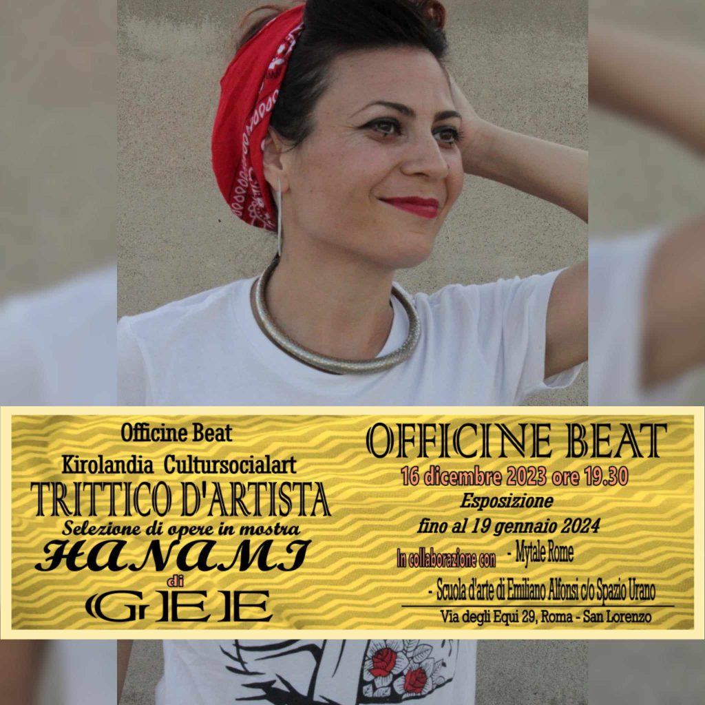 Roma – San Lorenzo – Officine Beat – Kirolandia – Cultursocialart Presentano TRITTICO D’ARTISTA II edizione Selezione personale di opere in mostra Prima esposizione con GEE “HANAMI” A cura di Andrea Alessio Cavarretta #scrittoremetropolitano Presenta: Stefania Visconti Organizzazione: Giovanni Palmieri e Sissi Corrado In collaborazione con Mytale Rome – Scuola d’Arte di Emiliano Alfonsi c/o Spazio Urano mOFFICINE BEAT mVia degli Equi 29, Roma – San Lorenzo Apertura esposizione: 16 dicembre 2023, ore 19.30 mOpere esposte fino al 19 gennaio 2024