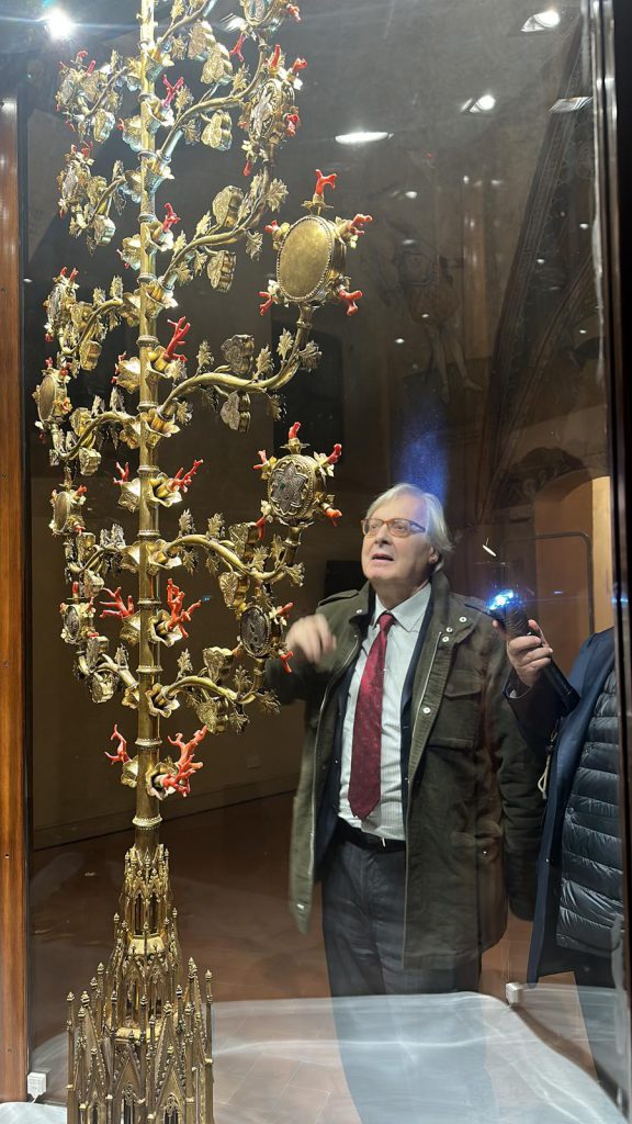 Sgarbi, di fronte al reliquiario unico al mondo risalente al XIV-XV secolo, alto 2 metri e 60, realizzato in oro, coralli e pietre preziose, recentemente balzato agli onori delle cronache per il ritrovamento di alcune parti trafugate oggetto di un delicato restauro a cura dell’Opificio delle Pietre dure di Firenze, si lancia poi in un bilancio molto personale: “Per me è stato un anno difficile, sono stato al Governo cercando fare cose utili, impedendo che sconvolgessero, distruggessero l’Italia e il suo paesaggio con orrende pale eoliche, violenza della mafia contro la bellezza, che tutt’ora continuano ad essere pensate da gente perversa che rappresenta il male. Quest albero, che è l’opposto di una pala eolica, è il pensiero di Dio sulla terra, l’idea che cresce nel pensiero di questi Santi e Profeti, con i coralli che augurano buona fortuna. Buona fortuna a tutti voi, italiani. I coralli erano il desiderio di mia madre che temeva la sfortuna che talvolta ci perseguita, temeva i violenti che ci fanno del male e cercava di sconfiggerli attraverso i coralli, li portava al collo. A mia madre dedico questi auguri”.