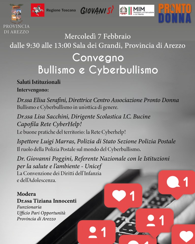 CONVEGNO NELLA SALA DEI GRANDI DEL PROVICIA DI AREZZO – La Provincia di Arezzo, con il partenariato dell’Associazione Pronto Donna e dell’Ufficio Scolastico ambito Territoriale di Arezzo, organizza il Convegno “Bullismo e cyberbullismo” che si terrà mercoledì 7 febbraio presso la Sala dei Grandi della Provincia di Arezzo L’iniziativa fa parte delle attività del progetto ” Bullismo e cyberbullismo: azioni in Rete per prevenire e contrastare un fenomeno in crescita” inserito nell’ambito di Giovanisì progetto della Regione Toscana per l’autonomia dei Giovani.