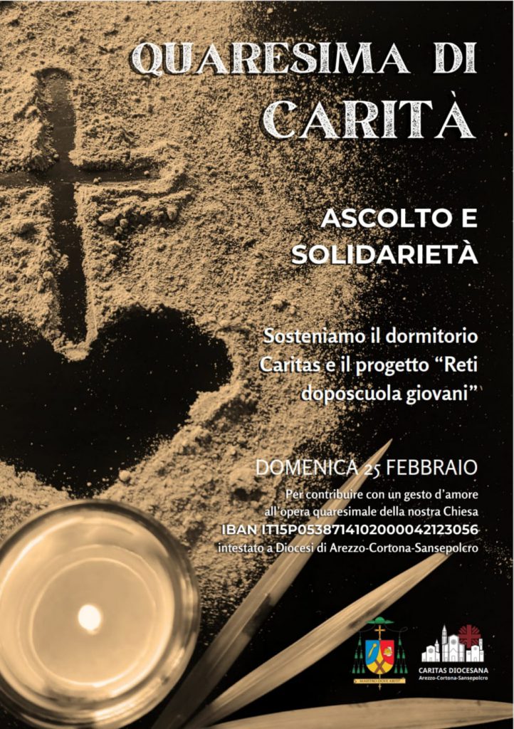 L’inizio della Quaresima coincide, quest’anno, con la vigilia della festa della Madonna del Conforto, e darà perciò un tono particolare alla conclusione della novena in preparazione alla grande festa mariana che si sta svolgendo in questi giorni. In Cattedrale, ad Arezzo, la celebrazione delle ceneri sarà presieduta dal vescovo monsignor Andrea Migliavacca alle ore 18, preceduta alle ore 17 da una liturgia penitenziale. Il vescovo Andrea guiderà la comunità diocesana lungo l’itinerario quaresimale e sarà presente, settimana dopo settimana, in ciascuna delle sette zone pastorali della diocesi per le tradizionali Stazioni Quaresimali, le quali sono fissate ogni venerdì alle 20.30 e prevedono, dapprima, una liturgia penitenziale con le confessioni individuali e, poi, la celebrazione eucaristica.Questo il programma delle Stazioni Quaresimali: venerdì 16 febbraio, Valtiberina, Concattedrale di Sansepolcro; venerdì 23 febbraio, Senese, parrocchia di Castelnuovo Berardenga; venerdì 1° marzo, Cortona-Castiglion Fiorentino, Collegiata di Castiglioni; venerdì 8 marzo, Casentino, parrocchia di Subbiano; venerdì 15 marzo, Valdarno, parrocchia di Santa Maria Nuova a Terranuova Bracciolini; venerdì 22 marzo, Valdichiana, parrocchia di Lucignano. L’emittente comunitaria della diocesi Tsd trasmetterà in diretta le Stazioni Quaresimali nel canale 85 (visibile in tutta la Toscana) e in streaming all’indirizzo www.tsdtv.it/live.“La Quaresima quest’anno è il dono che nel cammino dell’anno liturgico il Signore ancora ci fa – dice il vescovo Andrea Migliavacca -. È spazio e tempo per la conversione, quel cambiamento che lascia sempre più entrare lo sguardo di Dio nella nostra vita, su di noi e sulle vicende umane. Per noi quest’anno la Quaresima è ulteriormente arricchita dal richiamo all’esperienza delle stimmate di san Francesco di cui celebriamo gli 800 anni e che sono segno della forza dell’amore e della misericordia di Dio che segna la vita. La Quaresima che viviamo è anche occasione per rinnovare l’esperienza della preghiera e dell’ascolto a cui stiamo dedicando questo anno pastorale, con l’impulso del Papa a vivere l’anno della preghiera in vista del Giubileo del 2025. Il cammino verso la Pasqua che è annuncio del Risorto, della vita e della pace, ci impegni a rinnovarci nella testimonianza della pace, chiedendola con forza a ogni Istituzione che può contribuire a essa e facendoci noi costruttori di pace”.La Quaresima è tempo di carità, come si è ricordato: pertanto, anche la diocesi di Arezzo-Cortona-Sansepolcro aderisce alla colletta nazionale indetta dalla Presidenza della Conferenza episcopale italiana per domenica 18 febbraio 2024 a sostegno degli interventi umanitari e per progetti di pace e riconciliazione in Terra Santa. Si tratta di un segno concreto di solidarietà e partecipazione di tutti i credenti ai bisogni, materiali e spirituali, delle popolazioni colpite. Le offerte raccolte, che saranno inviate a Caritas Italiana, renderanno possibile la progettazione unitaria degli interventi e favoriranno il coordinamento anche con la rete delle Caritas internazionali che stanno intervenendo nei territori colpiti dal conflitto, con l’obiettivo di garantire sostegno a tutte le iniziative della Chiesa locale.Inoltre, a livello locale, la colletta della “Quaresima di Carità” promossa tradizionalmente dalla diocesi e che accompagnerà l’intero tempo quaresimale sarà indirizzata quest’anno al sostegno del dormitorio della Caritas e del progetto “Reti doposcuola giovani”. Per contribuire con un gesto d’amore all’opera quaresimale della nostra Chiesa diocesana è possibile fare un versamento sul conto corrente IT15P0538714102000042123056 intestato a Diocesi di Arezzo-Cortona-Sansepolcro, indicando nella causale “Quaresima di carità 2024”; alla “Quaresima di Carità” saranno inoltre devolute le offerte che saranno raccolte durante le liturgie domenicali di domenica 25 febbraio nelle chiese della diocesi.