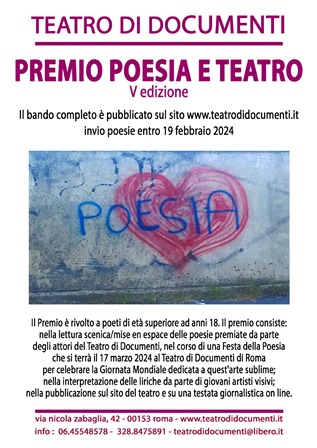 2 Le poesie (massimo tre), in lingua italiana, a tema libero, edite e inedite, con una lunghezza massima di 40 versi, vanno inviate via mail in un unico file a: teatrodidocumenti@libero.it entro e non oltre il 19 febbraio 2024. È richiesto un contributo di 20 € da versare tramite bonifico bancario a: Associazione Amici del Teatro di Documenti – Iban: IT53J0306909606100000128366 con la causale: a parziale rimborso spese segreteria del Premio.
