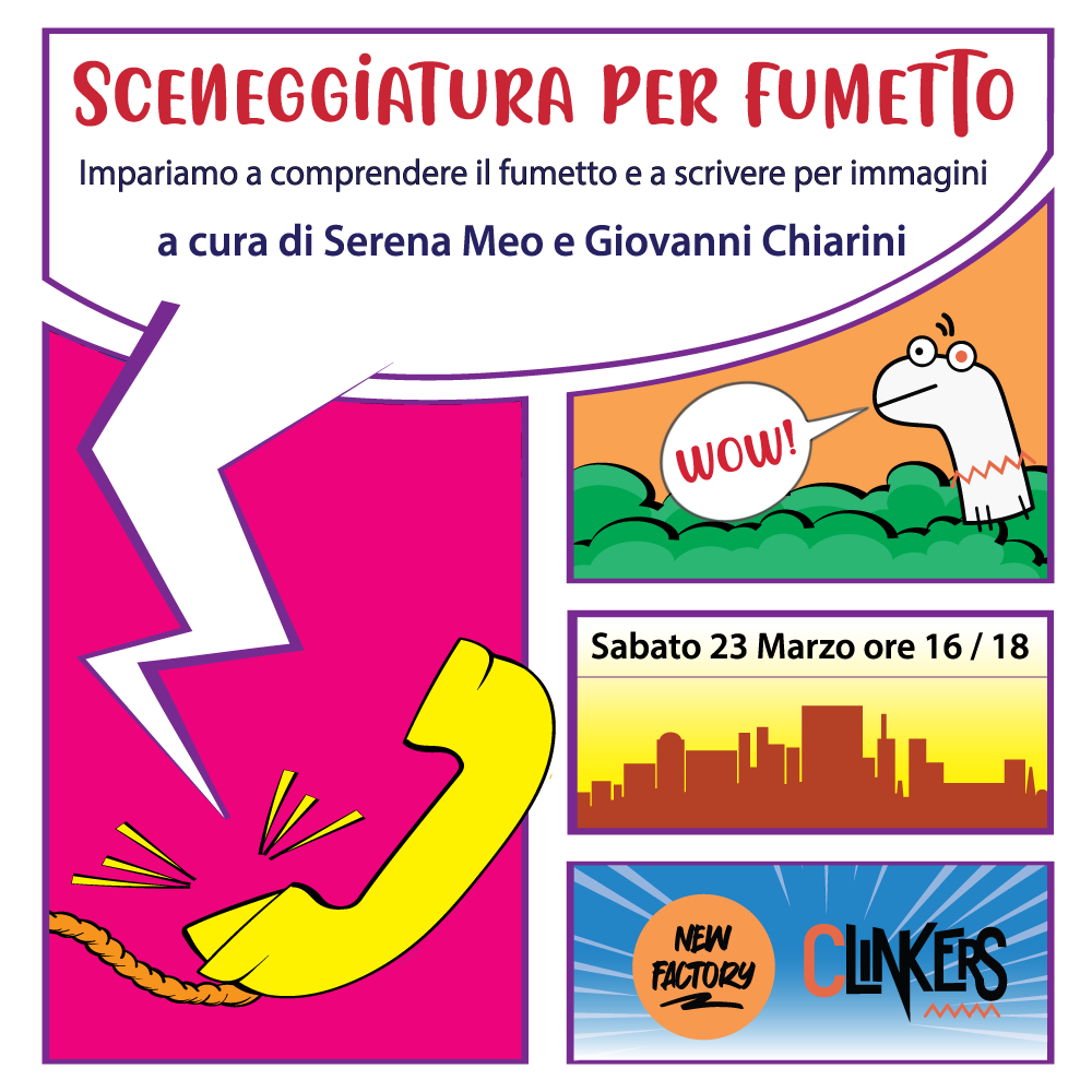 Iniziativa del Centro giovani comunale New Factory in collaborazione con l’associazione Clinkers Sabato 23 marzo alle 16 presso il Centro giovani comunale New Factory prende il via il laboratorio di sceneggiatura del fumetto, rivolto a giovani e adolescenti tra i 15 e i 35 anni, appassionati e curiosi. Il corso prevede sette lezioni per capire il medium del fumetto e imparare l’abc della sceneggiatura.
