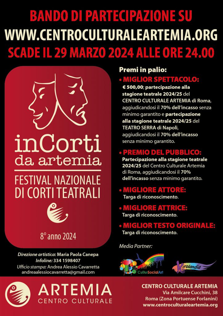 Per l’8° anno, a grande richiesta del pubblico e delle compagnie teatrali, il Centro Culturale Artemia è felicissimo di tornare a bandire la Rassegna-Concorso Nazionale per Corti Teatrali dal titolo “IN CORTI DA ARTEMIA – FESTIVAL NAZIONALE DI CORTI TEATRALI” dedicato ad artisti e gruppi operanti nel territorio nazionale italiano. Bando 8° anno 2024 XI° Stagione Teatrale 2023-2024 CULTURALE ARTEMIA Artistica: Maria Paola Canepa