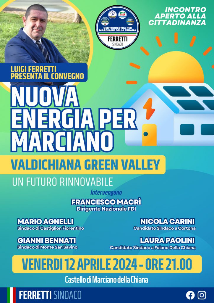 MARCIANO DELLA CHIANA – CONVEGNO A MARCIANO SULLE ENERGIE RINNOVABILI 12 APRILE 2024 E’ fissato per venerdì 12 aprile, presso il Castello di Marciano alle ore 21.00, l’appuntamento con tutta la cittadinanza per parlare di Comunità Energetica ed Energie Rinnovabili. “Vogliamo offrire una nuova prospettiva al nostro territorio – dichiara Luigi Ferretti candidato Sindaco per il centrodestra a Marciano della Chiana -, sfruttare i punti di forza che abbiamo per cambiare il paradigma che ha relegato per decenni Marciano alla marginalità.Attraverso il convegno del 12 aprile prossimo getteremo le basi per la nascita di un progetto innovativo che vedrà Marciano protagonista insieme ai comuni di tutta la Valdichiana”